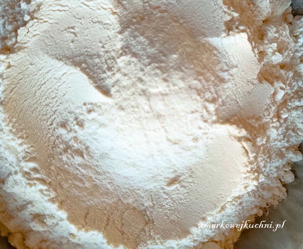 - Przesiej do miski 2 szklanki mąki i wsyp 2 łyżeczki proszku do pieczenia. Wymieszaj rózgą.