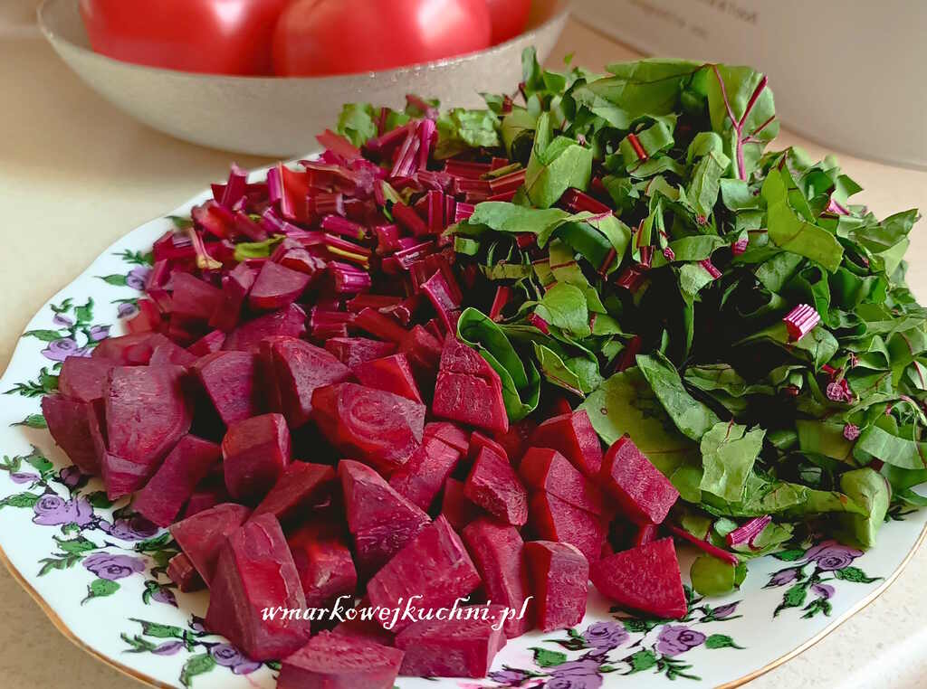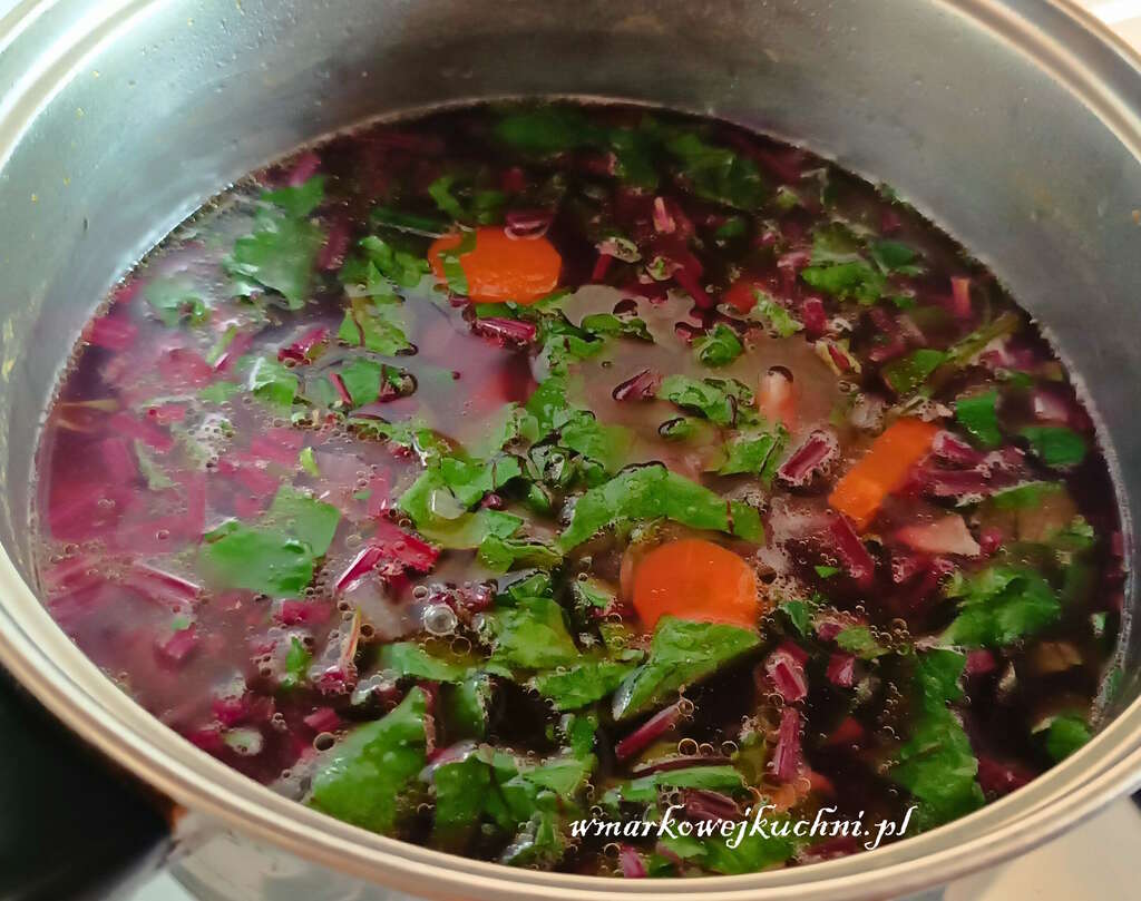 - Do gotującego się wywaru dodaj pokrojone w kostkę buraczki, po 5 minutach dodaj posiekane liście botwiny i gotuj około 5 minut. Ja lubię jak kawałki buraczków, są jędrne, a nierozgotowane. Zupę przypraw sokiem z cytryny i szczyptą cukru.