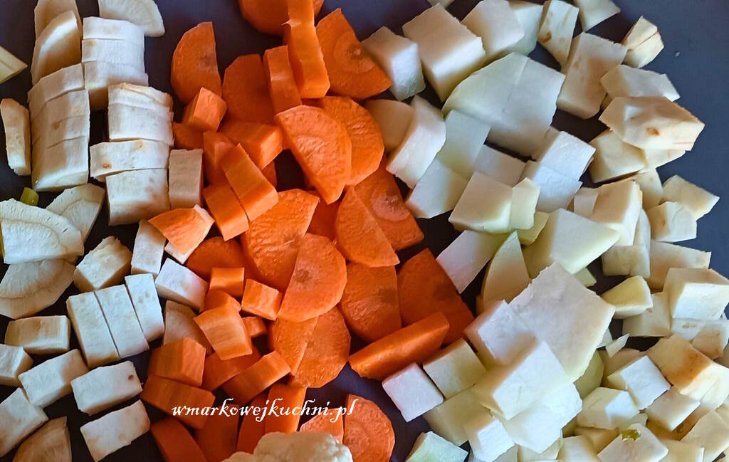 - Warzywa korzeniowe obierz i umyj pod bieżącą woda. Pokrój w kostkę.