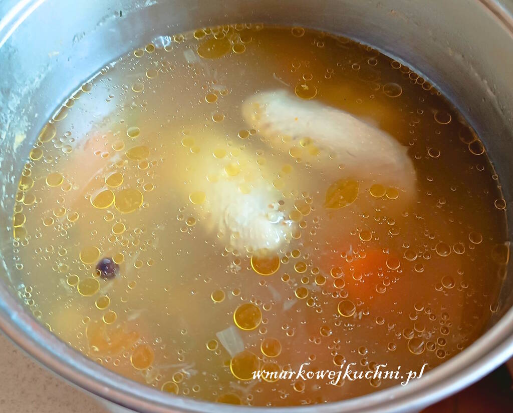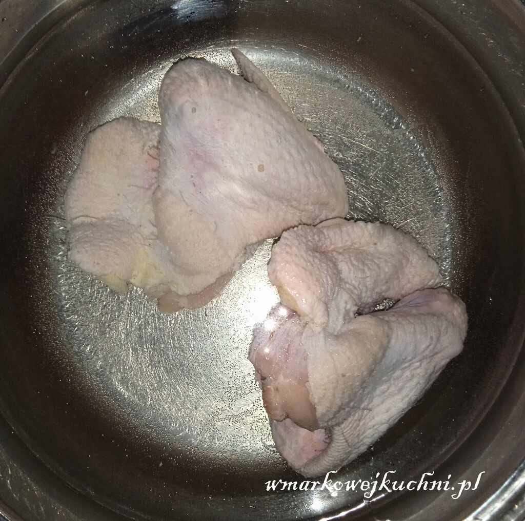 - Skrzydełka oczyść z ewentualnych pozostałości piór i umyj. Wlej do garnka 1,5 litra wody. Włóż skrzydełka, dodaj parę ziaren ziela angielskiego i dwa liście laurowe. Zagotuj i gotuj na małej mocy palnika. Usuń łyżką cedzakową powstałą szumowinę.