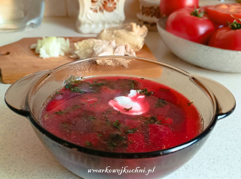 - Botwinkę na mięsnym wywarze zapraw śmietaną i posyp posiekanym koperkiem.
