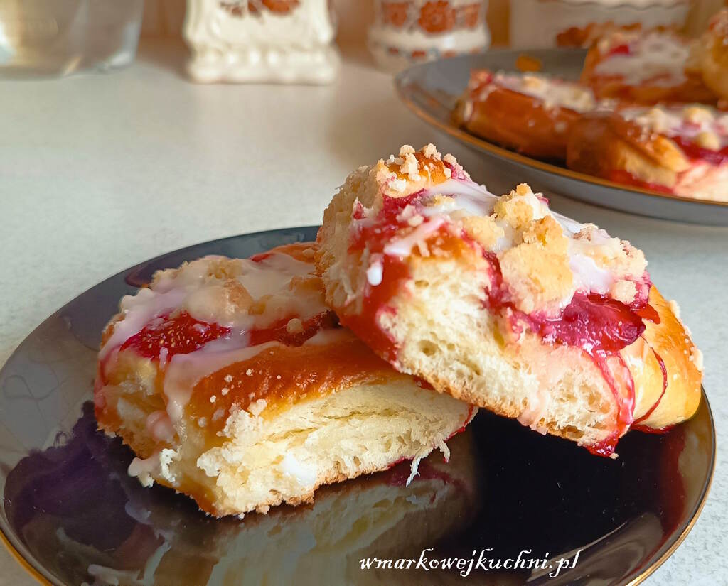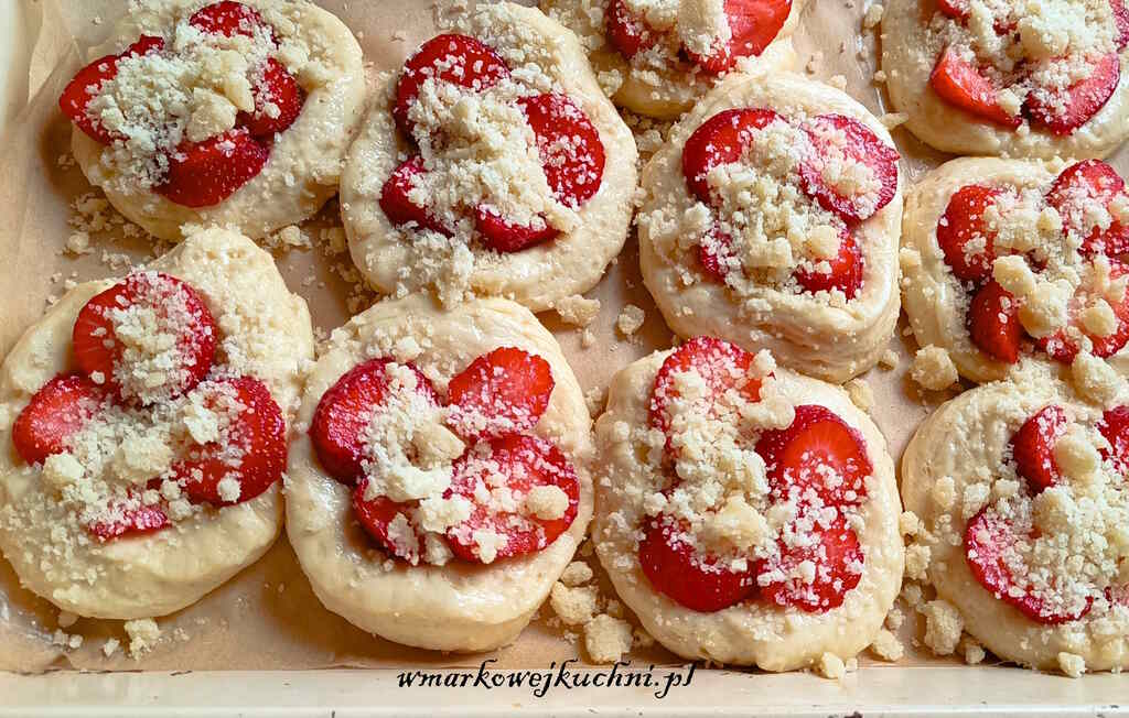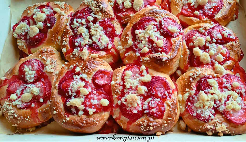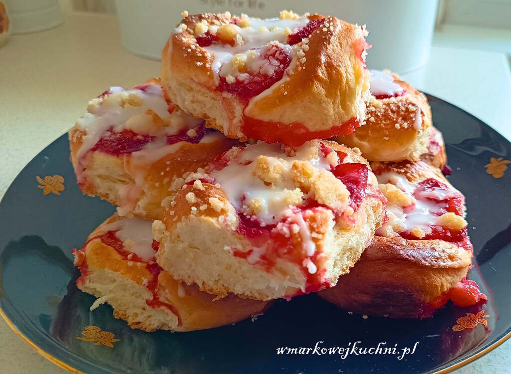 Drożdżówki z truskawkami i kruszonką to przepyszne bułeczki o niepowtarzalnym smaku posypane maślaną kruszonką i polane lukrem.