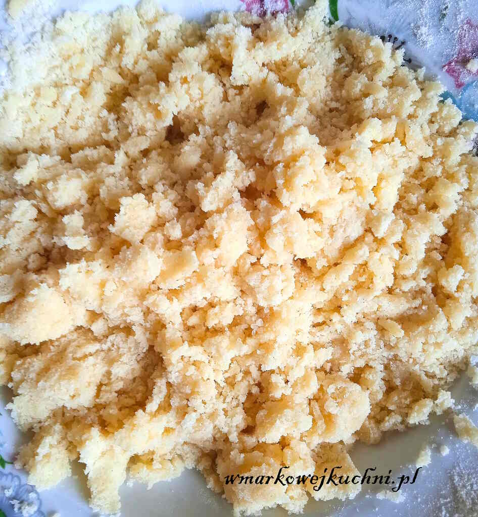 - Wsyp do małej miski 75 g mąki, 50 g cukru i wlej 50 g roztopionego masła. Składniki kruszonki rozetrzyj palcami, aż powstaną grudki. Odstaw.