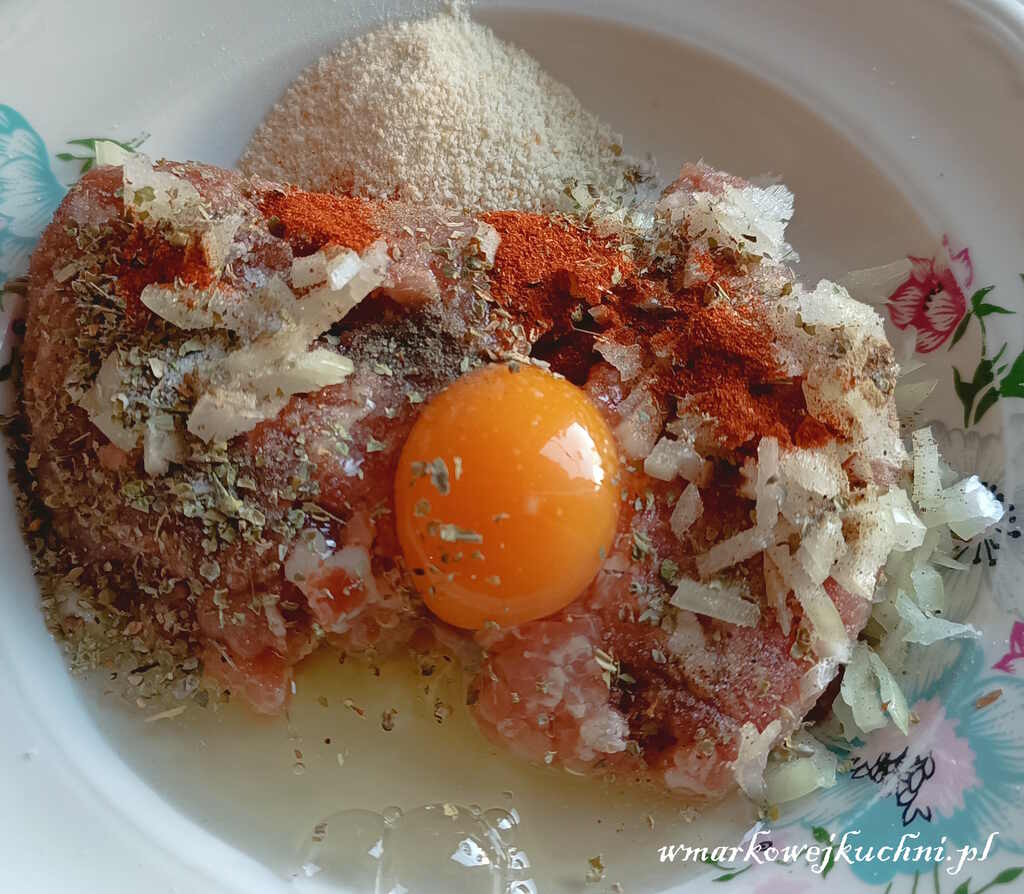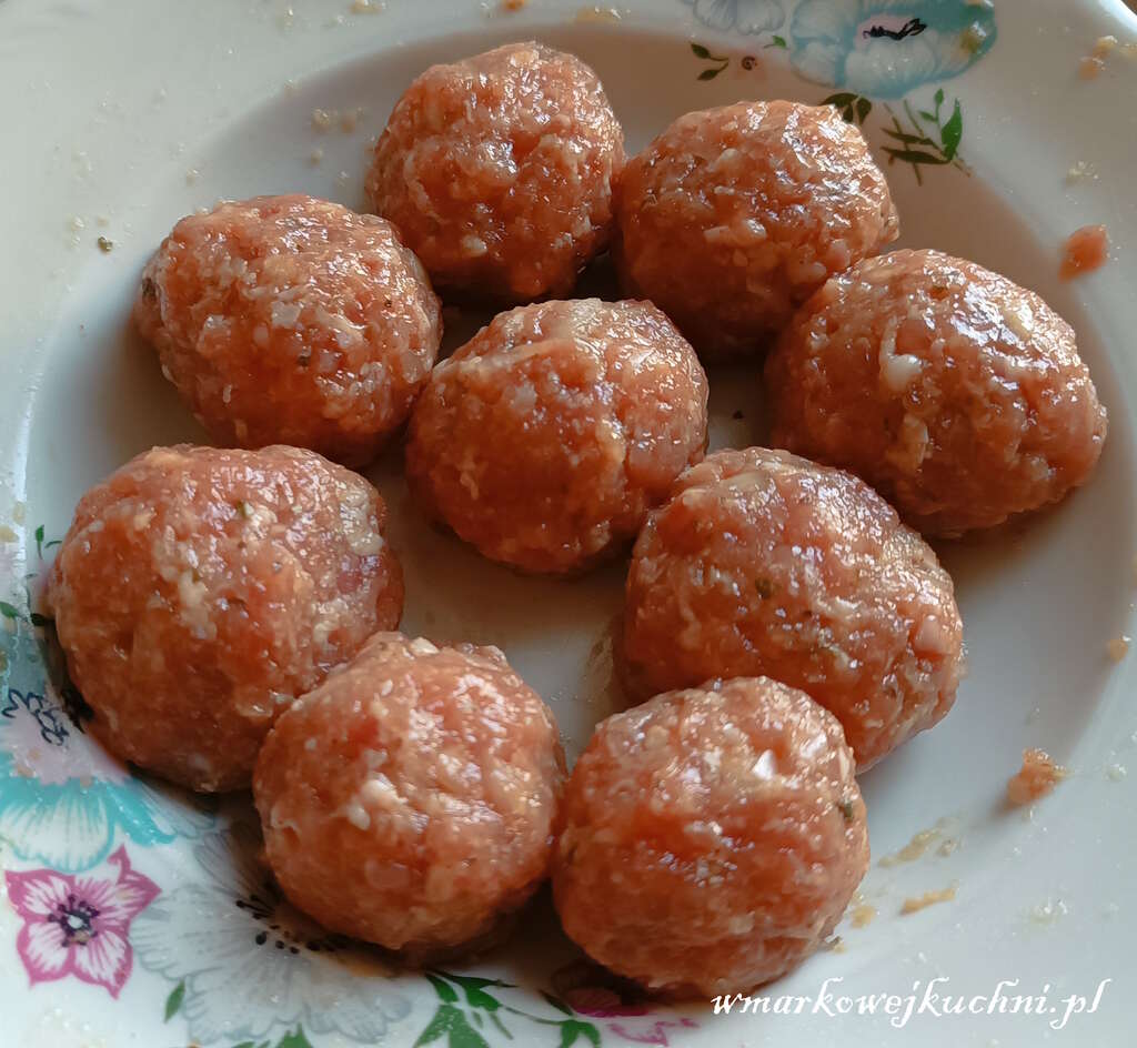 • Włóż do miski zmielone mięso, wbij jajko, wsyp bułkę tartą i przypraw solą, pieprzem, papryką, majerankiem, ziołami prowansalskimi. Składniki pulpetówWszystkie składniki starannie wymieszaj. Z masy mięsnej uformuj stosunkowo nie za duże klopsiki. Odstaw.Uformowane klopsiki