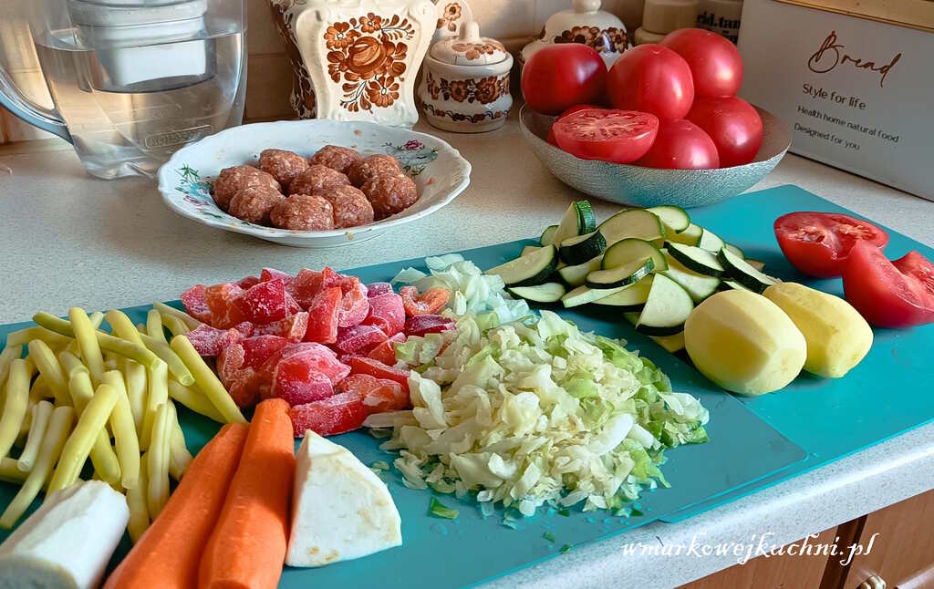 • Warzywa korzeniowe obierz. Umyj. Marchewkę, korzeń pietruszki pokrój w talarki. Korzeń selera pokrój w słupki lub kostkę. Ziemniaki pokrój w kostkę. Z papryki usuń gniazdo nasienne, umyj i pokrój w kostkę. Usuń końcówki ze strąków fasolki szparagowej, umyj i pokrój na krótsze kawałki. Opłucz kawałek kapusty i poszatkuj nożem. Odetnij końcówkę cukinii, umyj i pokrój w talarki. Pomidora umyj i sparz wrzątkiem, obierz skórkę i pokrój w kostkę.Rozdrobnione warzywa