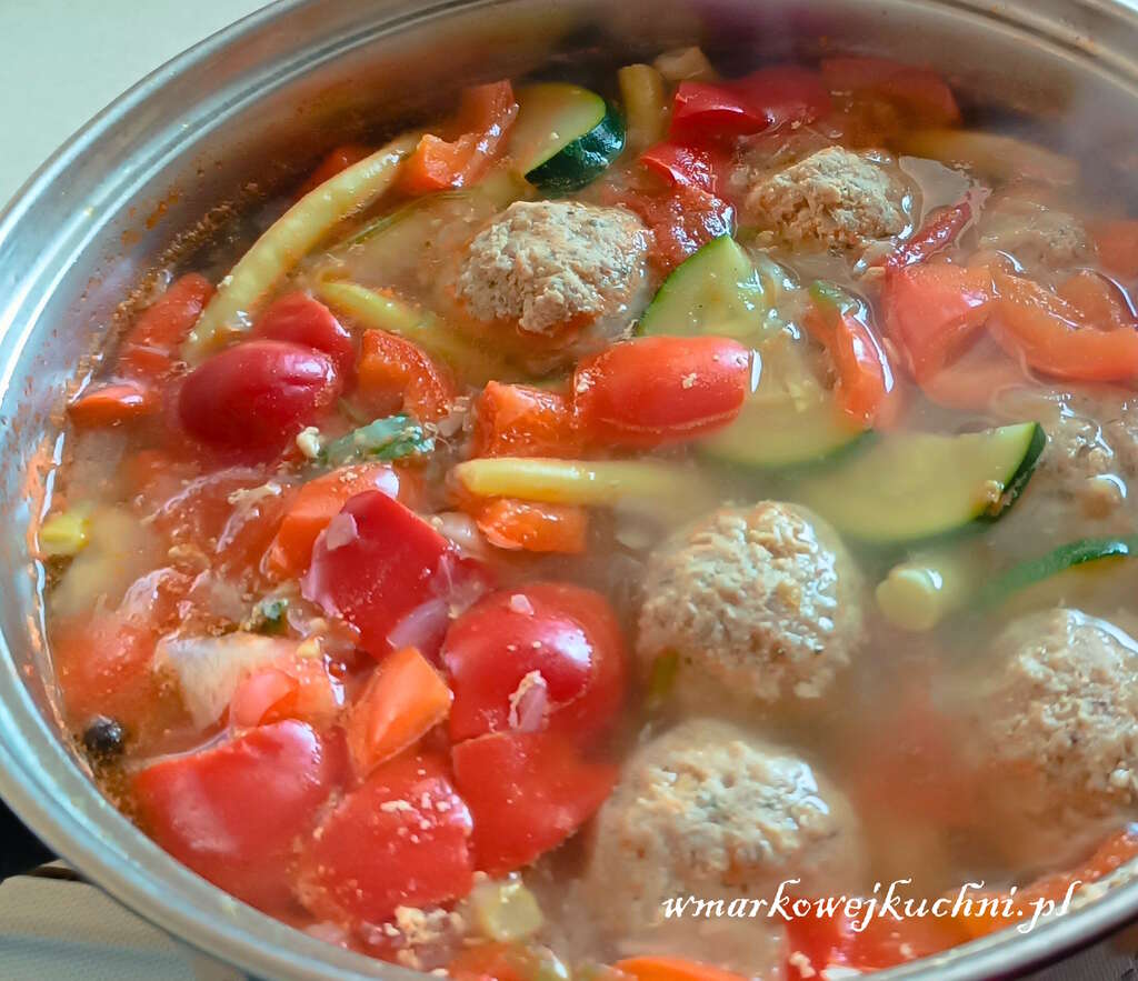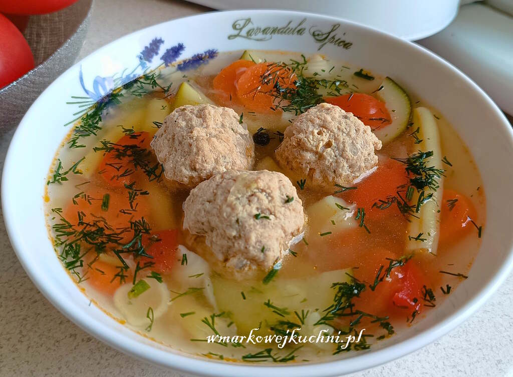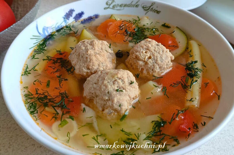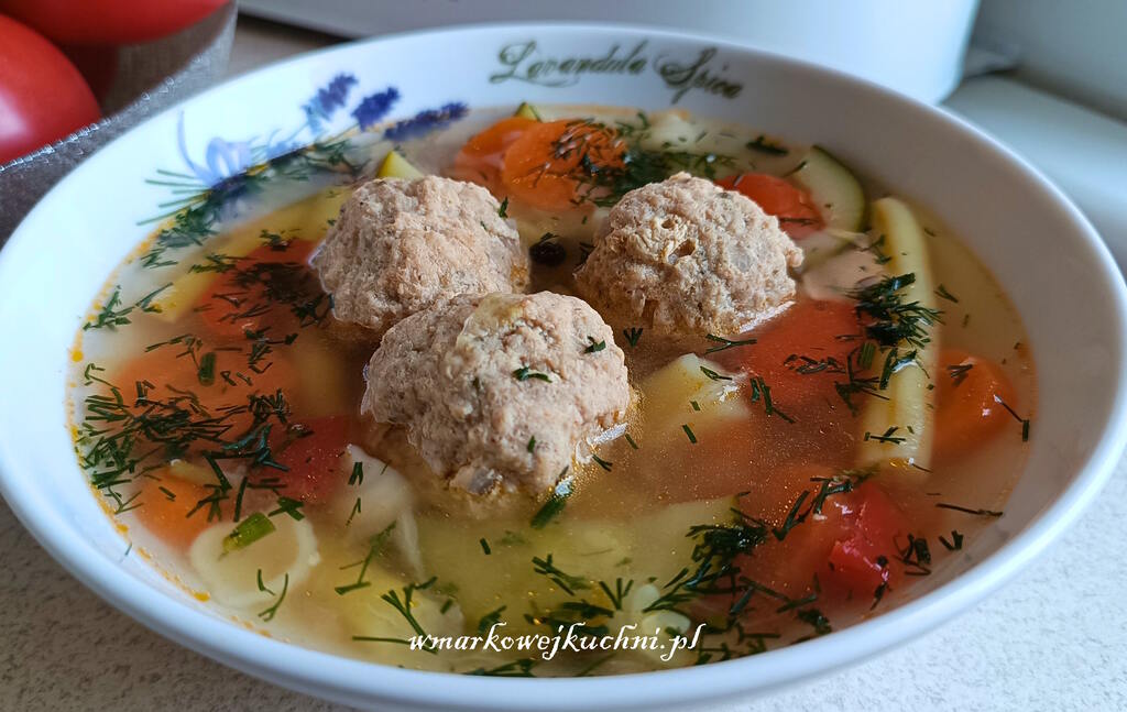 Letnia zupa z przepysznymi klopsikami drobiowymi. Gotowana jest na bazie zupy jarzynowej. To jest naprawdę super przepis na danie jednogarnkowe.