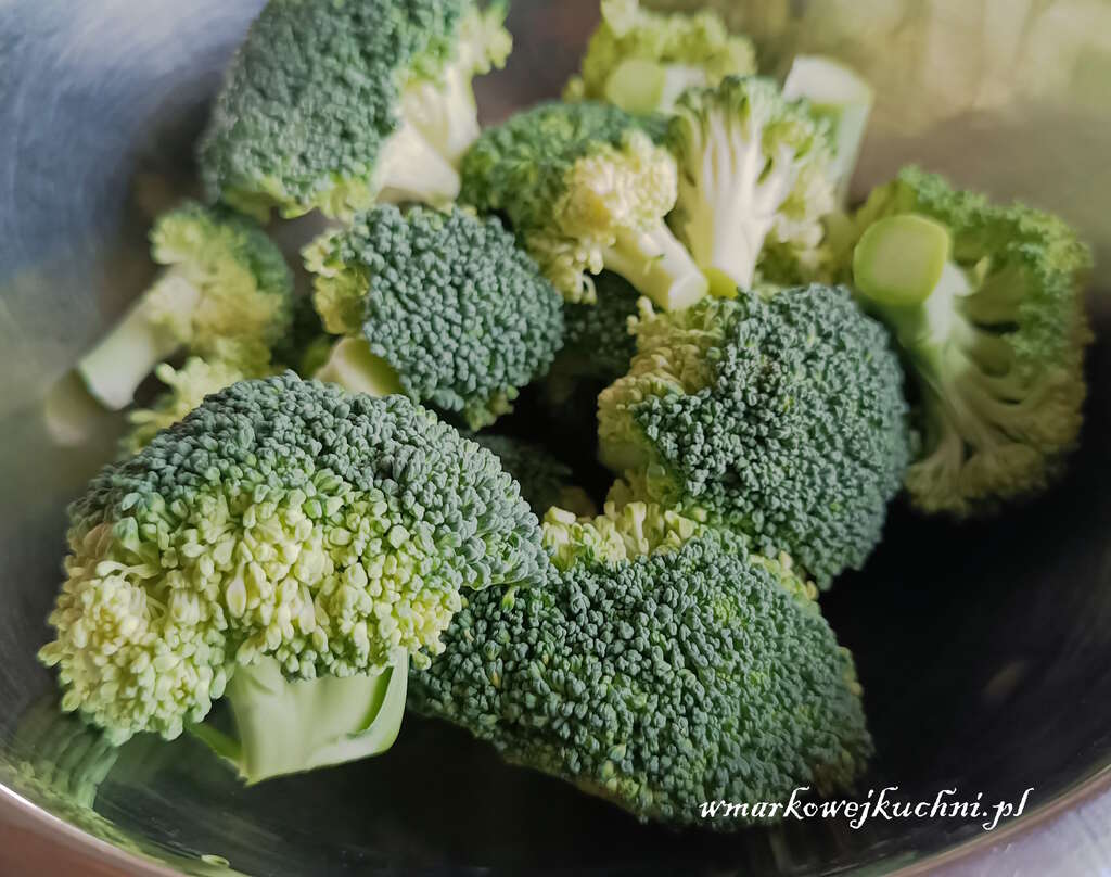• Brokuł podziel na różyczki. Głąb obierz z grubej skórki i pokrój w kostkę. Głąb brokułu jest bardzo smaczny, nadaje się do przyrządzania zup i zapiekanek. Różyczki i głąb umyj pod bieżącą wodą. Różyczki brokułuZagotuj posoloną wodę w garnku, włóż brokuł i głąb i gotuj 2/3 minuty. Wyjmij warzywo i odstaw.