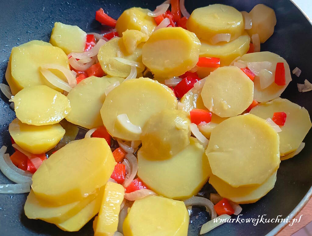 • Rozgrzej na patelni łyżkę masła, włóż ziemniaki, pokrojoną cebulę i paprykę. Smaż na średniej mocy palnika przez 5/7 minut, zamieszaj od czasu do czasu.Obsmażanie ziemniaków, papryki i cebuli