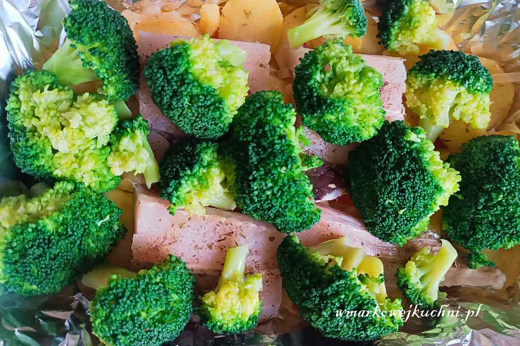 • Nagrzej piekarnik do 200oC, grzanie góra/dół. Naczynie żaroodporne wyłóż folią aluminiową i wysmaruj dobrze masłem. Rozłóż zawartość patelni na dnie naczynia. Na wierzchu połóż kawałki ryby, a na nich rozłóż różyczki brokułu i pokrojone kawałki głąba. Układanie warstw zapiekanki.Zapiekanka gotowa do pieczenia.