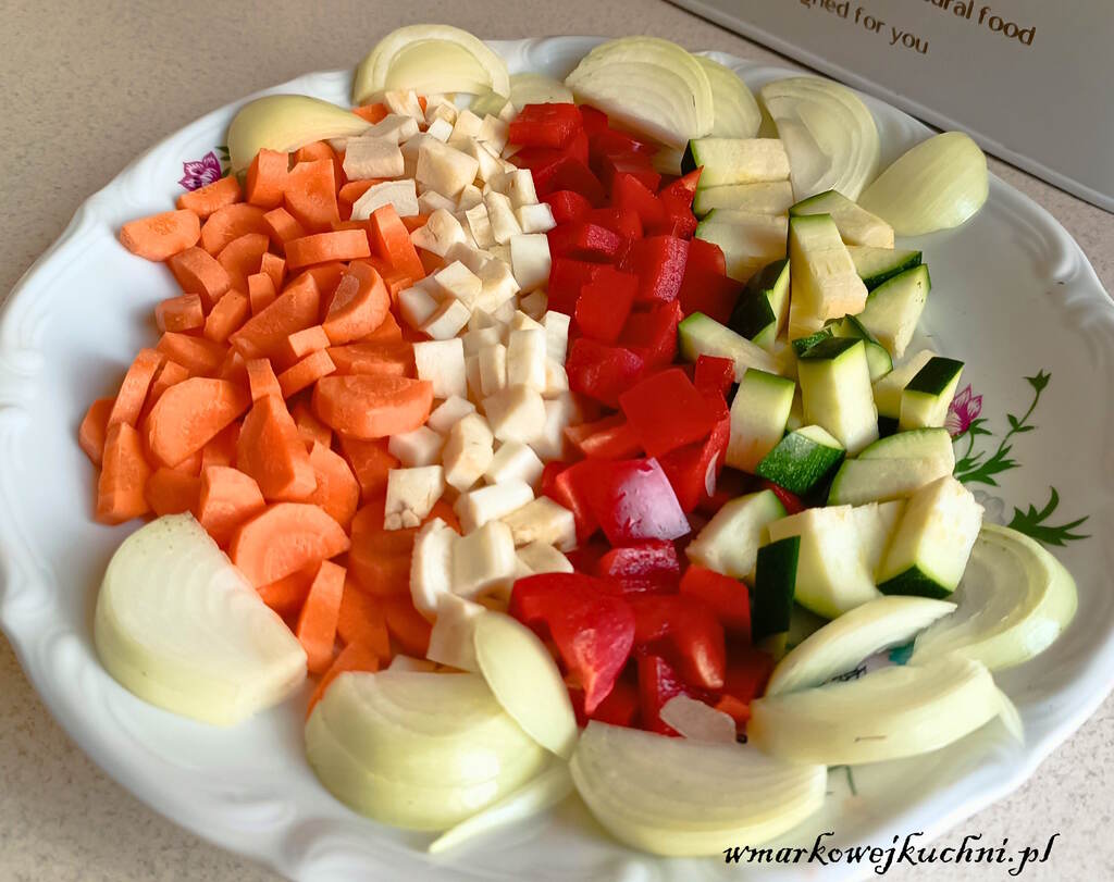 Marchewkę, korzeń pietruszki i selera obierz i umyj. Pokrój w kostkę. Połówkę papryki i kawałek cukinii umyj i pokrój w kostkę. Cebulę obierz i pokrój w piórka.