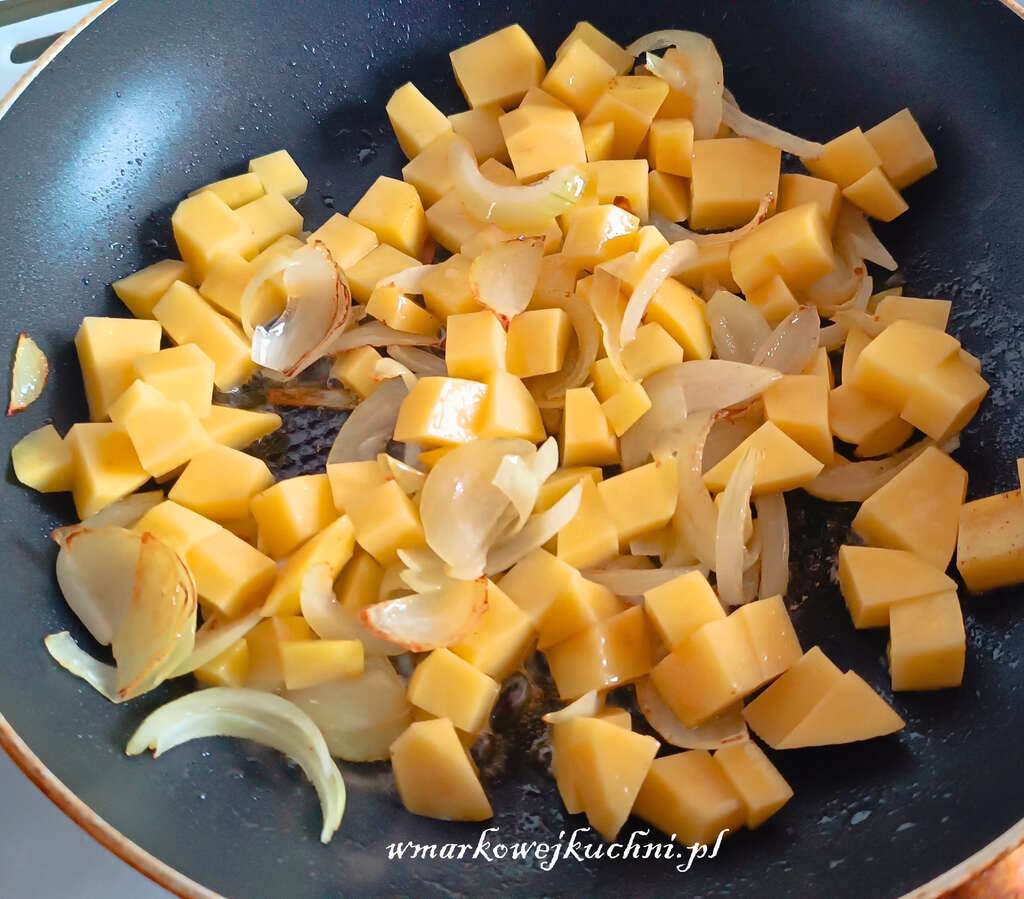 - Ziemniaki obierz i umyj. Pokrój w kostkę.