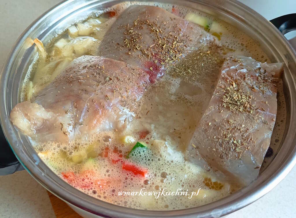 - Zagotuj w garnku litr bulionu, dodaj kulki ziela angielskiego i liście laurowe. Włóż pokrojone warzywa i gotuj na małej mocy palnika przez 10-15 minut. Po tym czasie dodaj kawałki ryby i gotuj, aż wszystkie warzywa będą miękkie, ale nierozgotowane. Zupę rybną przypraw solą, pieprzem, papryką oraz ziołami.